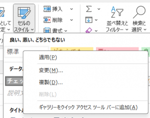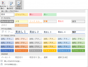 (1)リボンの「ホーム」タブ「セルのスタイル」をクリックしてダイアログを開きます。
