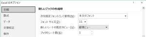 このダイアログの全般ダイアログに新しいブックの作成時というタイトルのグループがあり、そこに「次を既定フォントとして使用」の項目があります。次の例では「本文のフォント」となっています。