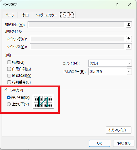 図左) 最初に、行方向にページを進め、次に列方向にページを進める(Excelのダイアログでは「左から右」)