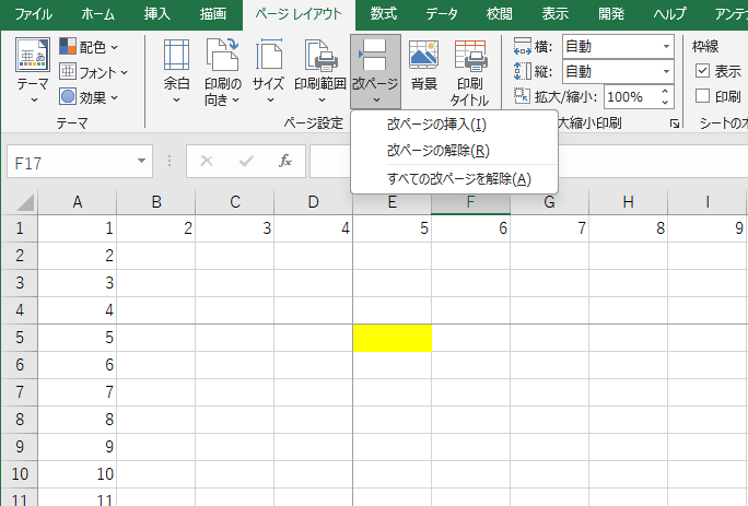 ワークシートで、特定のセル以降の行または列から新しいページを始めたいときは、そのセルに「改ページ」を入力します。次の図は、セル:E5に「改ページの挿入」を行っている例です。