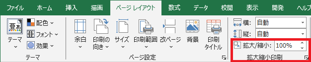 リボン「ページレイアウト」の「拡大/縮小」メニューで、ワークシートからPDFを作成するとき原寸のままPDF化するか拡大・縮小するかを指定できます。既定値は原寸(Excelのメニューでは「100%」)です。