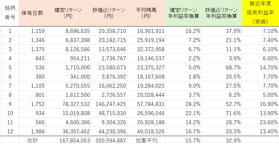 当社で1年以上保有している銘柄(12銘柄)について、実際のところどうなっているのかをまとめてみました。