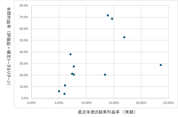 この12銘柄について、最近年度の経常利益率(実績)を横軸に、株式運用のリターンを縦軸にとってプロットすると次の図のようになります。