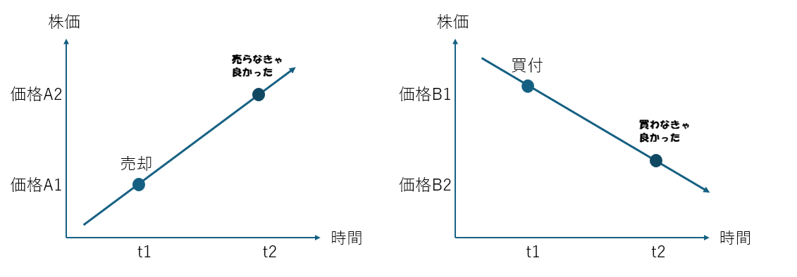 (1)はt1時点に株価A1で売ったが、後のt2時点には株価はA2に上昇、売るのを待てば良かったと反省するパターン。上昇トレンドの最中に売ってしまったのが間違いだった、(2)はt1時点に株価B1で買付、後のt2時点には株価がB2に下落したので、買うのを待てば良かったと反省するパターン。下降トレンドにある最中に買い付けたのが間違だったということです。ただし、t1時点には後のt2時点に上がるか下がるかは分かりません。景気の山や谷を事後的に判定するのと同じで株価のピークや底、トレンドは事後的にしか決定できません。間違いと決めつけるのは無理筋かもしれません。