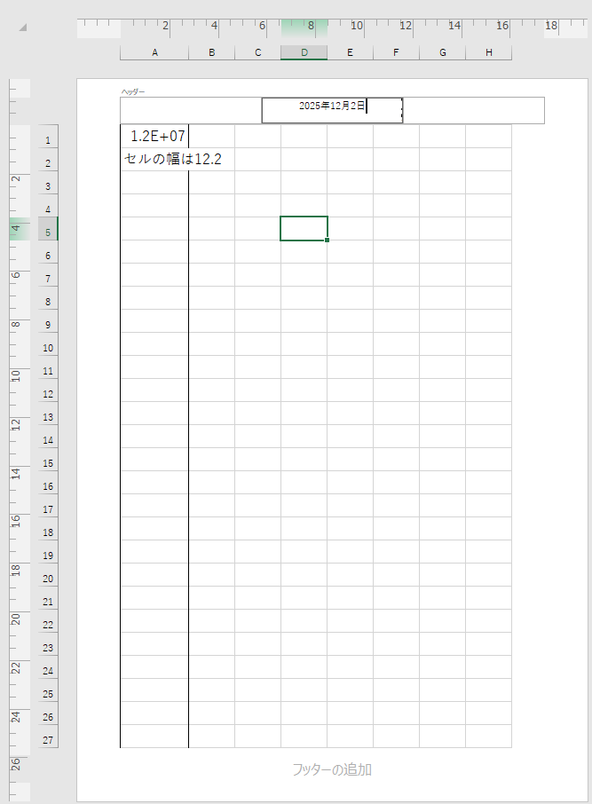 「レイアウトモード」では、画面上にページレイアウトを表示しながら、セルに文字を入力したり、ヘッダやフッタを編集したりできます。但し、「標準」モードのレイアウトと完全互換でないことは上の図でセルの数字が桁数オーバーフローしていることから分かります。