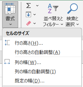 「標準」モードでは列の幅と行の高さを、リボン「ホーム」の「書式」メニューで確認・設定できます。