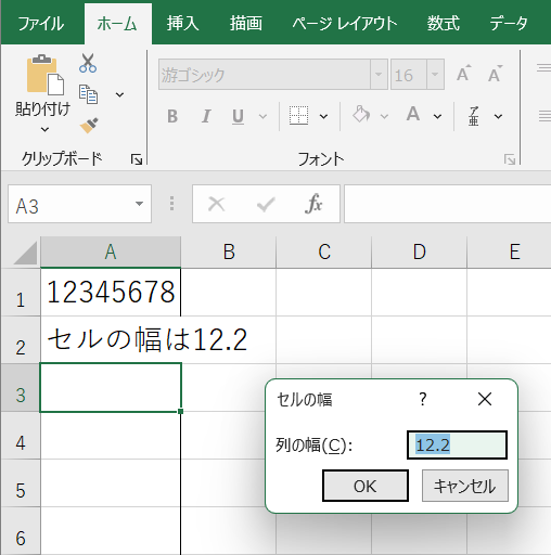 ここではブックの標準フォントは游ゴシック11ポイント、ワークシート全体は游ゴシック16ポイントを設定しています。1行A列には、16ポイントのアラビア数字がちょうど8文字入っていますが、セル幅の設定を確認すると12.2です。これは、セル幅が11ポイントで12.2文字分であることを示しています。こうして、セル幅のカウント基準はブックの標準フォントであることが分かります。